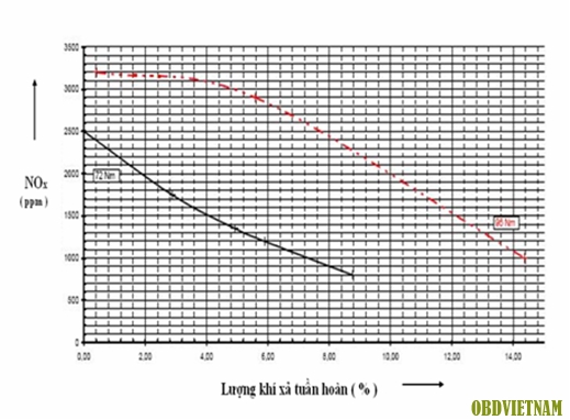 Tất cả các điều này dẫn tới việc làm giảm áp suất, nhiệt độ cháy và từ đó làm giảm lượng NOx được hình thành. Trong hình 2 cho thấy kết quả thử nghiệm ảnh hưởng của lượng khí thải tuần hoàn đến lượng NOx đối với động cơ BMW 3.0, tại số vòng quay 2500 vg/min: ở chế độ công tác 72Nm, khi đưa một lượng khí thải bằng 8% thể tích hỗn hợp thì so với trường hợp không có khí thải tuần hoàn ( 0 % ) hàm lượng NOx giảm từ 2500 ppm xuống còn 900 ppm; Ở chế độ công tác 96 Nm, khi lượng khí thải tuần hoàn bằng 14,2 % thể tích hỗn hợp thì hàm lượng NOx giảm từ 3200 ppm xuống còn 1000 ppm.