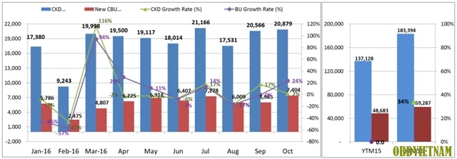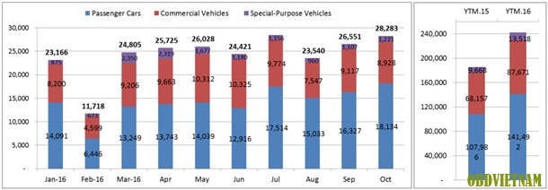 Tính đến hết thág 10/2016, tổng doanh số bán ô tô của cả nước đạt 242.681 xe các loại, tăng 30% so với cùng kỳ năm ngoái. Trong đó, xe ô tô du lịch tăng 31%, xe thương mại tăng 29% và xe chuyên dụng tăng 40%.