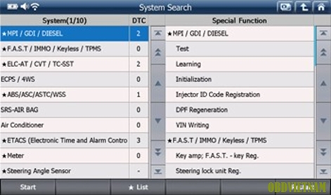 “System Search”, với tùy chọn này, thiết bị cho phép kiểm tra tất cả các hệ thống được trang bị trên xe một cách tự động và báo số lỗi tìm thấy và có sẵn cho các tính năng chẩn đoán nâng cao trong mỗi hệ thống dò tìm được.